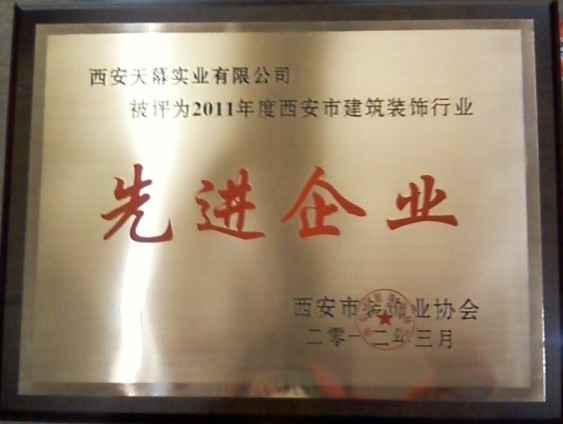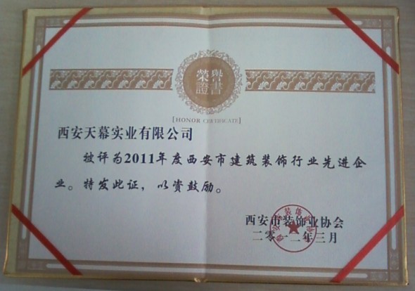 2012年初,由西安市裝飾協(xié)會組織、特邀專家評審并進(jìn)行通報(bào)表彰的“西安市2011年度優(yōu)秀企業(yè)、先進(jìn)單位” 評審工作三月底圓滿結(jié)束,我公司被評為“2011年度優(yōu)秀企業(yè)”。