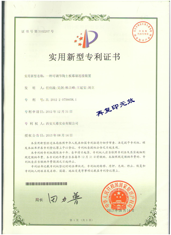 我公司再獲國(guó)家知識(shí)產(chǎn)權(quán)局頒發(fā)的"一種可調(diào)節(jié)陶土板幕墻連接裝置"實(shí)用新型專(zhuān)利,于近日獲得產(chǎn)權(quán)證書(shū)。