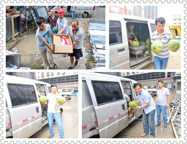 面對近期出現(xiàn)的高溫天氣,公司領(lǐng)導(dǎo)十分重視,不僅對工地的作息時(shí)間做了調(diào)整,同時(shí)也備用了許多防暑藥品。貌似我們的行動(dòng)已經(jīng)感動(dòng)上蒼,突如其來的一場暴雨,瞬間詮釋了我們此行的意義,但雨水絲毫沒有影響我們送關(guān)愛的心情,當(dāng)一個(gè)個(gè)西瓜,一袋袋白糖、綠豆、茶葉,一條條毛巾交到工友們的手上時(shí),滿臉汗水的他們露出了感激的微笑……在每個(gè)工地簡單的交流間隙,雷總和劉主任也是反復(fù)強(qiáng)調(diào)和叮囑工友們“一定要注意安全,多喝水,如遇大風(fēng)大雨天氣,要停止施工,安全責(zé)任重于一切”。