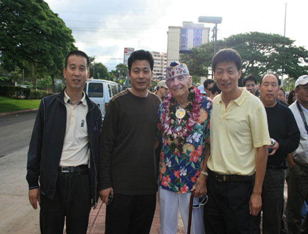 珍珠港事件唯一幸存的美國老兵:雖然已有約90歲高齡,卻仍然精神抖擻。頭戴美國海軍帽,脖子上佩戴著象征美好和平的花環(huán)。每天在附近的紀念館做義工,已有數(shù)十年。