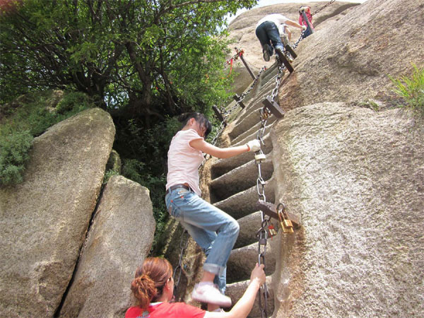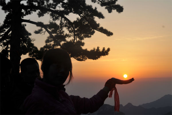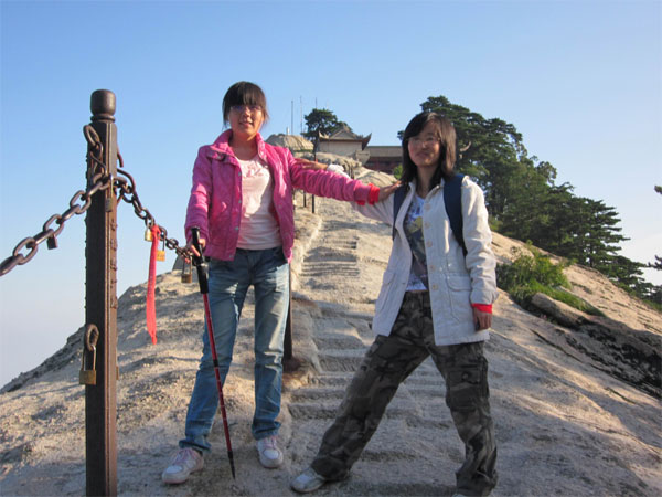 看完日出之后天已經(jīng)大亮,原本驚險(xiǎn)的華山毫無遮攔的展現(xiàn)在我們腳下,美麗的風(fēng)光已讓人目眩不止、震驚不已,勢(shì)若天梯的千尺幢,鬼斧天成的老君犁溝……一座座雄奇險(xiǎn)峻的山峰,就像一把把利劍直插云霄,牽著朦朧的煙霧在山顛彌漫。山顛上的小亭忽隱忽現(xiàn),仿佛“霧中仙閣”!隨后我們相繼游玩了其他各峰,包括“華山論劍” 的北峰和俗稱“華山之巔”的南峰;那高秀云表的天外之峰,那紅色盡染的圣奇靈山,真讓人心曠神怡,眉宇大展……還有仰天池,我們每個(gè)人都在此處合影留念。