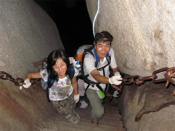 夜晚的月光分外皎潔,空氣異常清新,時(shí)時(shí)還伴著陣陣的水流聲,從沒(méi)有在夜間享受過(guò)如此心境的我們感覺(jué)里真是到了人間仙境呀!走在最前邊的同事信心百倍,一路領(lǐng)先。不時(shí)停下來(lái)等待后面的同事趕上,看到趕上來(lái)的同事,一起說(shuō)著鼓勵(lì)的話,讓人感到無(wú)盡的關(guān)懷和振奮,往日的煩惱也在此刻一掃而光。當(dāng)征服了華山險(xiǎn)境“千尺幢”和“老君犁溝”的時(shí)候,我們每個(gè)人都已汗流浹背,氣喘吁吁了。累了,找個(gè)較為平坦的地方暫坐休息;渴了、餓了,拿出隨身背的水和食物吃上一兩口,又繼續(xù)趕路。一路上,我們總是有說(shuō)有笑,互相幫助,彼此鼓勵(lì),真是其樂(lè)無(wú)窮呀!