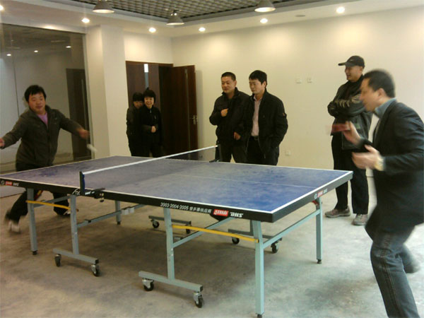 看,就在今天午休時間,在公司地下一層健身房內(nèi),便上演了一場激烈的乒乓球比賽。比賽選手分別是工程部朱總和市場部吳經(jīng)理,這兩人可算是旗鼓相當(dāng),各具所長,為了不錯過這場精彩的比賽,我自告奮勇客串起了裁判,樊叔監(jiān)戰(zhàn),其余人觀戰(zhàn)。