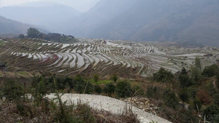 2015年2月6日我們一行8人乘車(chē)去游覽“龍脊梯田”??赡苁侨サ募竟?jié)不合適吧,景色很一般,但梯田的氣勢(shì)卻令我們?yōu)橹@嘆;從山腳盤(pán)繞道山頂,,小山如螺,大山似塔,層層疊疊,高低錯(cuò)落,從高處望去梯田的優(yōu)美線條,或平或交叉,蜿蜒如春螺,披嵐似云塔,顯示了動(dòng)人心魂曲線美,其線條行云流水,規(guī)模磅礴壯觀,宏偉,值得我們贊嘆!藏族同胞辛勤勞作的美德給我留下深深的印象。下午我們游覽了“義江緣”。義江緣是桂西北少數(shù)民族風(fēng)情景區(qū),觀看了農(nóng)家風(fēng)貌,農(nóng)耕文化和田園風(fēng)光,也領(lǐng)略理桂林八景之首的義江風(fēng)光。