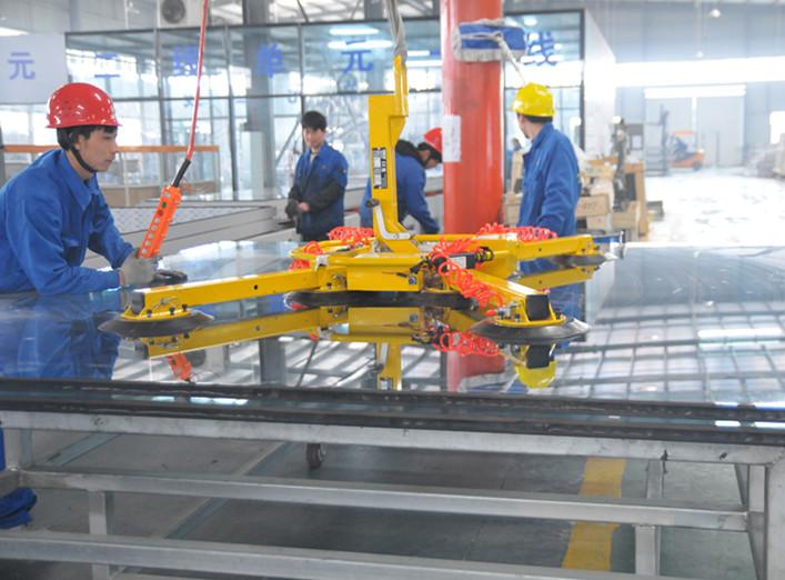 受場地制約,加工廠無航吊,只能采用叉車運輸單元板塊?,F(xiàn)場人員在這種情況下發(fā)明了一個鋼托體,可以吊裝三到四平米的板塊,換個方向就可以吊裝12平米的板塊。所有板塊用寬尼龍帶固定,以避免板塊吊裝過程中受力變形。在此崗位上安排兩名工人,板塊的堆放、輸出及外運順序都由他們配合完成,避免出錯。這種簡單快捷的方式節(jié)約了經(jīng)濟(jì)成本,也減少了板塊的破損率。