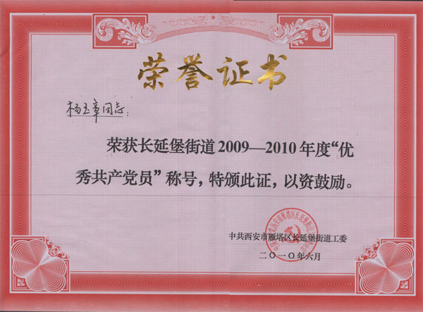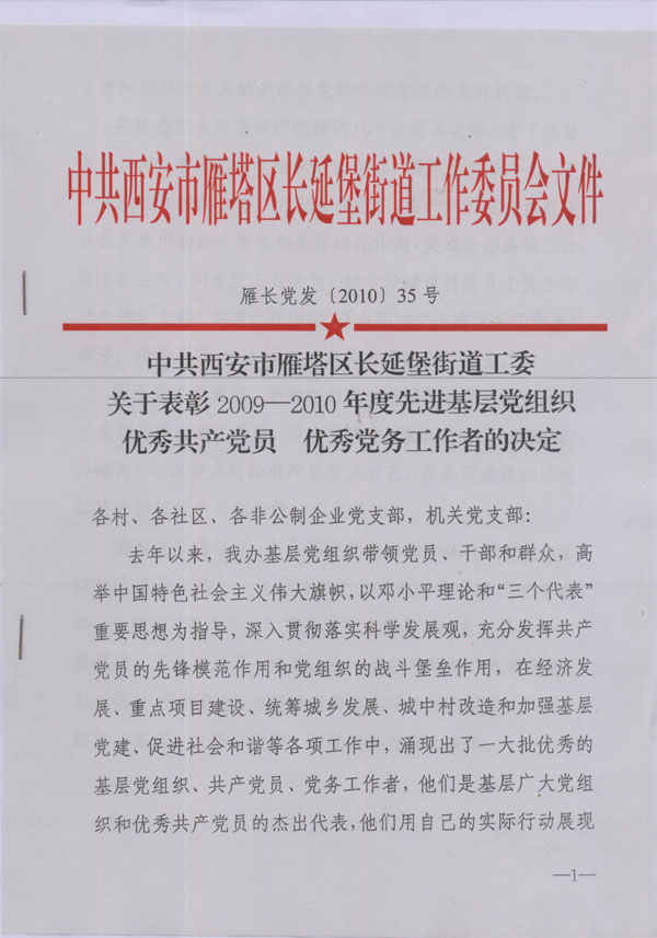 今天中共西安市雁塔區(qū)長延堡街道工委發(fā)布了“關(guān)于表彰2009—2010年度先進(jìn)基層黨組織優(yōu)秀共產(chǎn)黨員 優(yōu)秀黨務(wù)工作者的決定”,在街道辦所屬的非公有制企業(yè)中,我公司黨支部書記楊玉章同志被評為本年度優(yōu)秀共產(chǎn)黨員,這標(biāo)志著我公司黨支部在發(fā)展建設(shè)的道路上又出新成績。