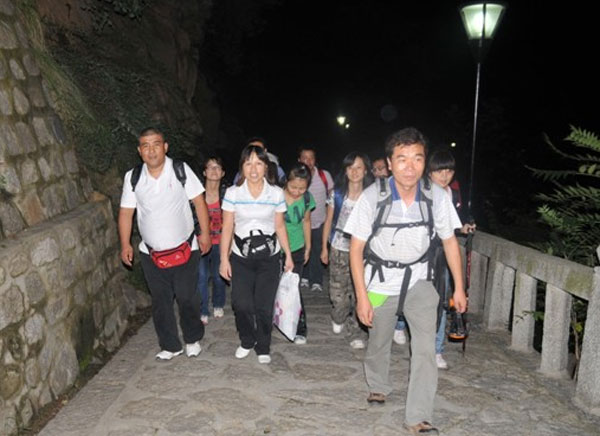 當(dāng)日晚上10點(diǎn),我們的隊(duì)伍來(lái)到華山腳下的玉泉苑。在即將登山之前,吳總召集大家開(kāi)了個(gè)小會(huì),以自己的實(shí)際登山經(jīng)驗(yàn),告誡大家在登山中的注意事項(xiàng),并安排好每個(gè)人的不同職責(zé),質(zhì)檢部樊部長(zhǎng)自告奮勇?lián)?dāng)前鋒,大家最后檢查了各自的裝備,群情激昂中開(kāi)始了我們的華山之行。
