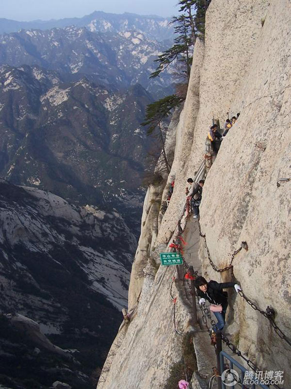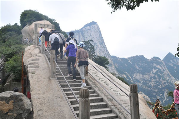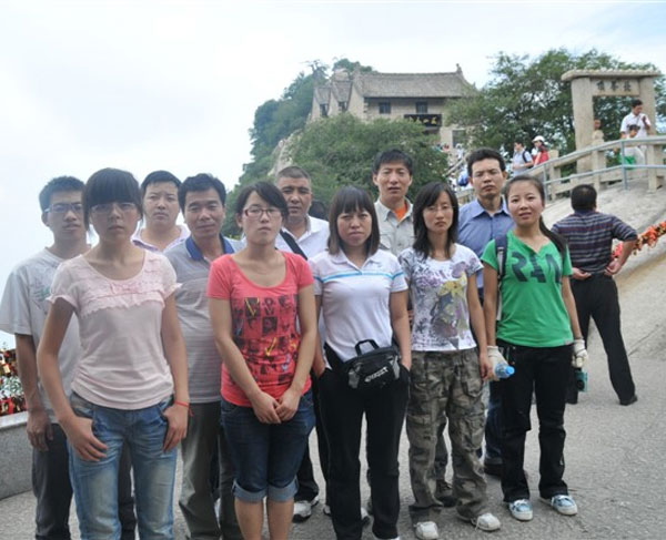 ,連猴子都發(fā)愁,說(shuō)明崖壁是多么陡峭了。在這兩處,我們第一次領(lǐng)略了華山的“險(xiǎn)”,真所謂舉步艱難。這時(shí),走在前面的樊部長(zhǎng)不斷的回頭告誡大家,手要抓穩(wěn),腳要踩實(shí)。吳總也是一次一次鼓勵(lì)大家,堅(jiān)持到底,就是勝利,同時(shí)又將兩個(gè)員工的行李背在了自己肩上。在他們這種精神的感召下,就連我們團(tuán)隊(duì)中年齡最大的王經(jīng)理也不甘示弱,奮勇直上。這時(shí)有個(gè)膽小的女游客發(fā)出驚叫,原來(lái)她在回頭看時(shí),對(duì)著陡峭的山谷一下恐慌起來(lái),同伴們沒(méi)有放棄,一片鼓勵(lì)聲中,伸出堅(jiān)強(qiáng)有力的臂膀推著她,一起越過(guò)險(xiǎn)關(guān)。道路雖是艱險(xiǎn),可也讓我們感受到,一步一個(gè)驚喜,一步一次超越。